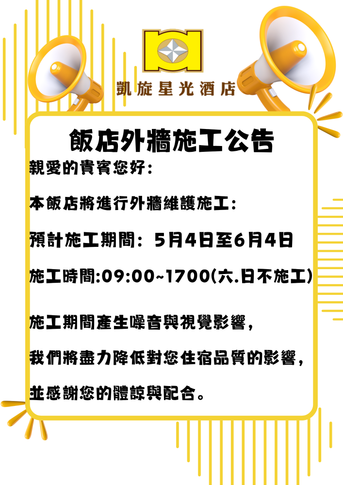 親愛的貴賓您好:為提供更加安全與舒適的住宿環境,本飯店將進行外牆維護與保養工程,相關資訊如